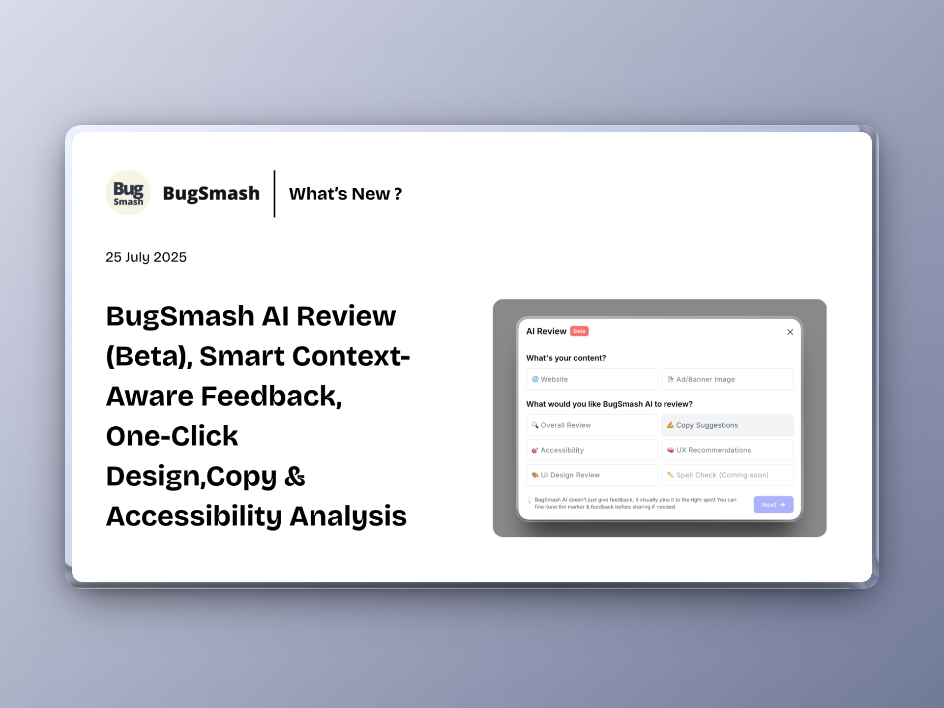 BugSmash AI Review (Beta), Smart Context-Aware Feedback, One-Click Design/Copy/Accessibility Analysis
